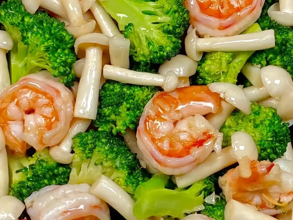 3、热锅烧油,油热以后,放入虾仁煸炒至变色后,再加入蒜末炒香,接着倒入西兰花和海鲜菇一起翻炒。
