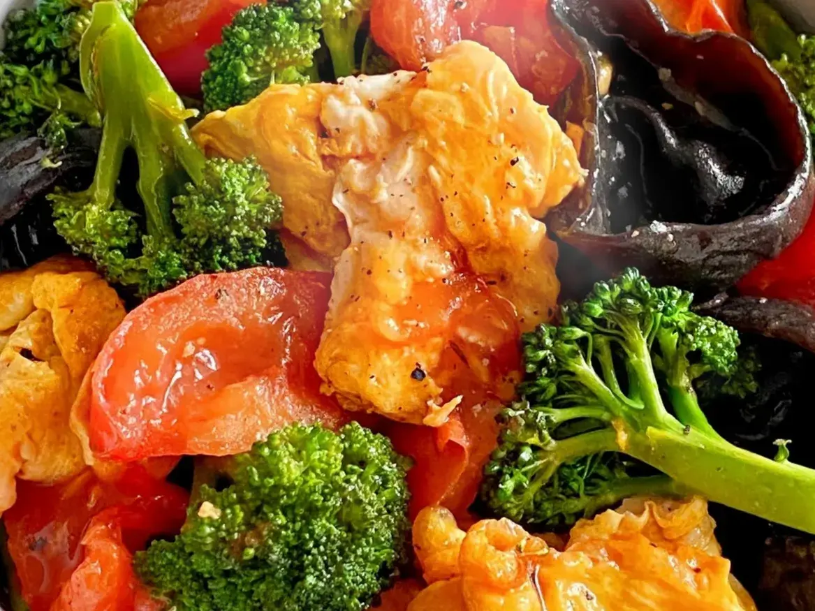 准备食材: 西兰花、木耳、番茄、鸡蛋、蒜末。