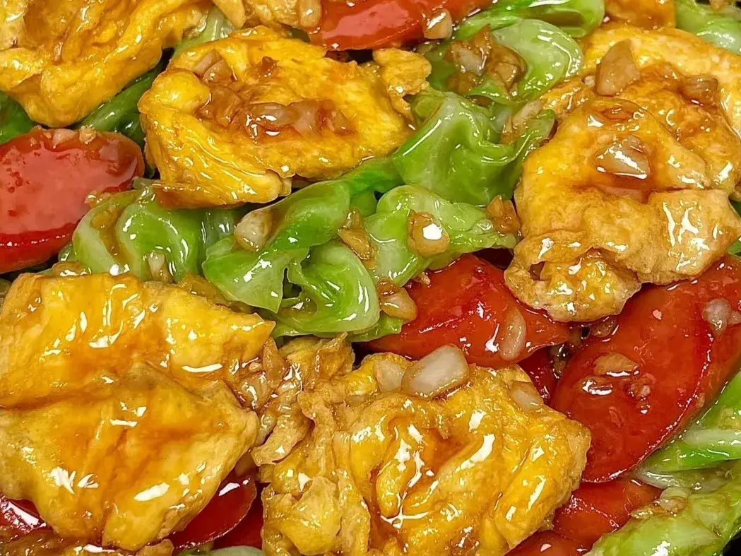 5、最后加入鸡蛋和瘦肉一起翻炒均匀入味,即可出锅开吃。